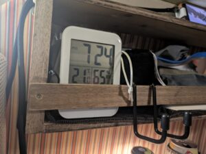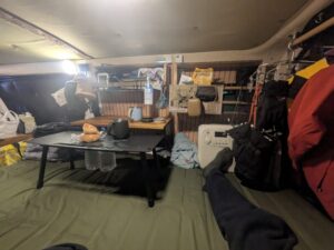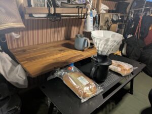 車内も10℃ほどまで下がっていましたが、ここからが「動く家」の本領発揮です。カセットガスストーブ「マイ暖」を点ければ、車内はあっという間に20℃以上の夏日に変わります。