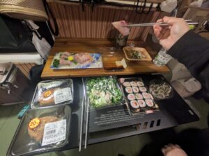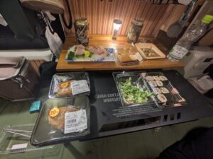 車内に広がる炊飯の幸せな香り。外は極寒なのに、車内では半袖になれるほど暖かく、熱々のご飯とスーパーで調達したお刺身で乾杯です。
